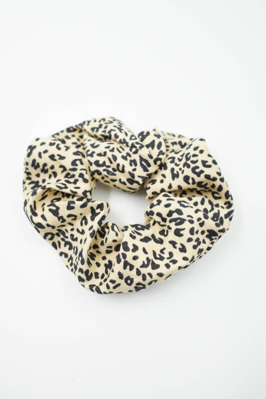 Scrunchy βελουτέ animal print μαυρο-μπεζ, μεσαίου μεγέθους.